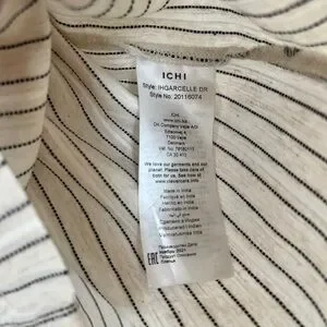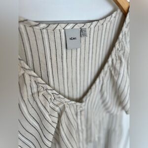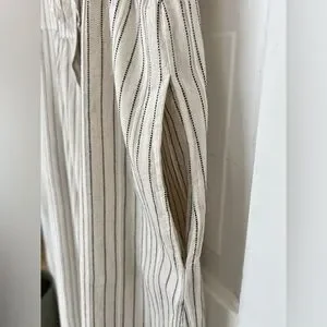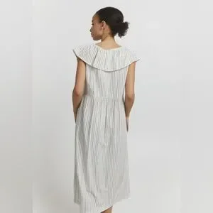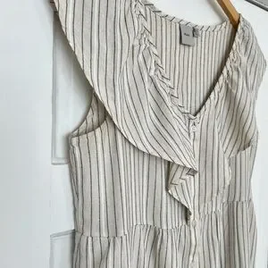 Natural sand colour with thin black and white stripes. V-neck with ruffle detail and button-up front. Loose, comfortable fit that falls below the knee. Hidden side pockets. Approx measurements: waist 19.5”, pit to pit 19.5”, length 45”.