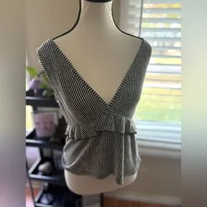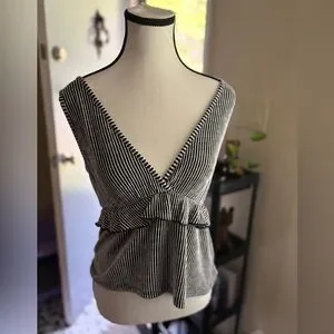 Elevate your style with this chic striped V-neck top. Featuring a flattering ruffle detail, this black and white top is perfect for any occasion. Material is soft and comfortable. Size S