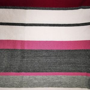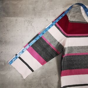 Stylish striped V-neck sweater with a mix of colors. Features red, pink, gray, and white stripes. Perfect for casual wear.