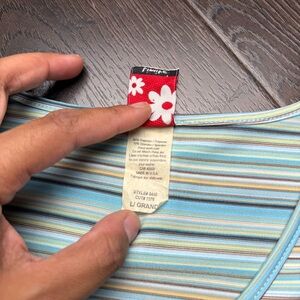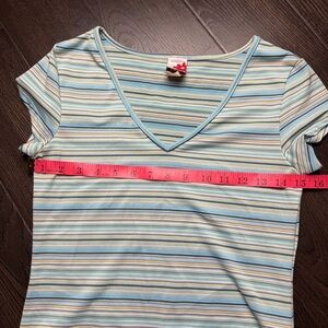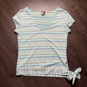 Major Y2K mall-girl vibes with this Limité USA made striped baby tee 💖 Featuring pastel blue, yellow & brown stripes, a flirty v-neck cut, and an adorable side tie bow detail 🪩💿. Stretchy + fitted = perfect for layering with cargos, mini skirts, or low-rise jeans ✨