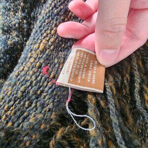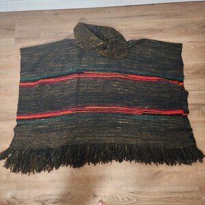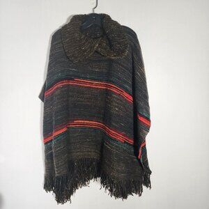 Striped Wool Poncho Fringe Boho Hippie Brown Red OS
