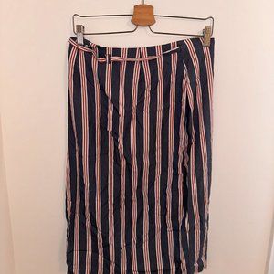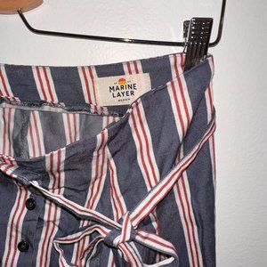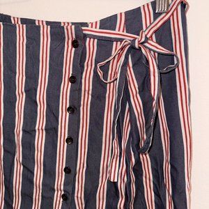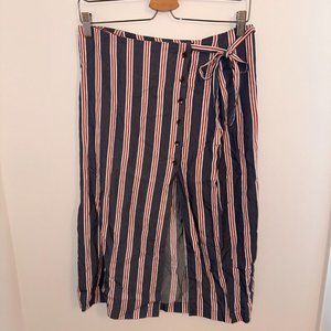 Originally bought from the Marine Layer store on Abbott Kinney in Los Angeles, California, this striped skirt is mid-length and wraps around the waist. It has detailed and functional buttons at the front with an open slit.
