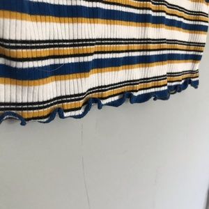 Blue, white, black and yellow crop top with lettuce hem on the sleeves and bottom. Stretchy and soft. Great condition.