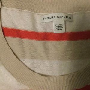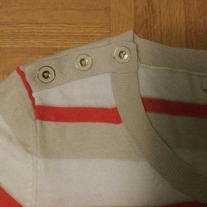 Banana Republic pullover sweater with 3/4 length sleeves. Orange, off white, and beige/very light taupe stripes. Size XL. Three enamel and gold-coloured buttons on each shoulder. 60% cotton, 40% polyester. Worn only once or twice.