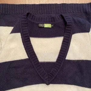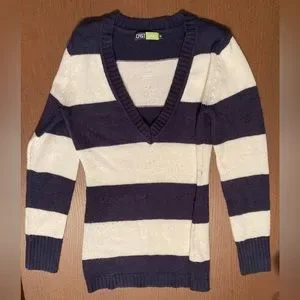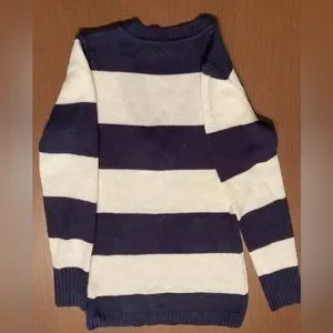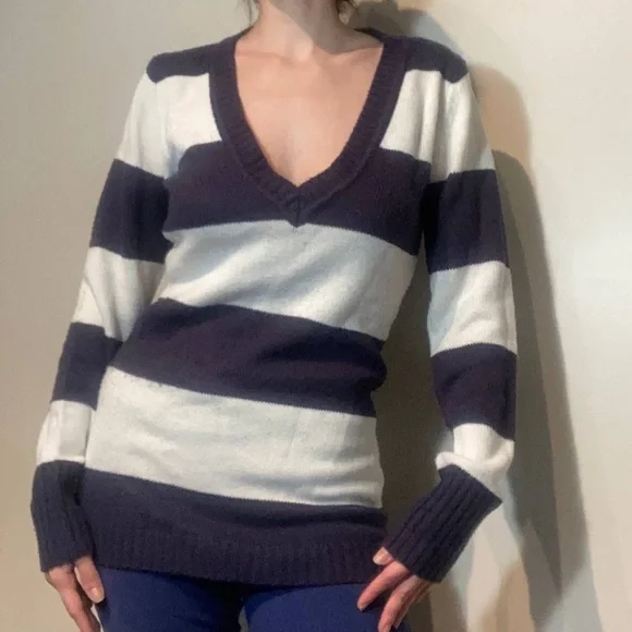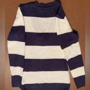 Dark blue and white striped sweater. Loose fit, long length (hips length) with V neck. Size medium.