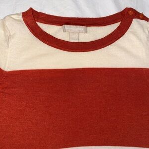 "This cream-colored sweater from Banana Republic features bold burnt orange stripes and a round neckline. With its slim fit, it hugs the body comfortably, making it ideal for fall. The sweater includes two buttons on the shoulder and has a slightly tapered bottom band for a flattering fit. Size S, it’s thin yet cozy, perfect for layering in cooler weather."