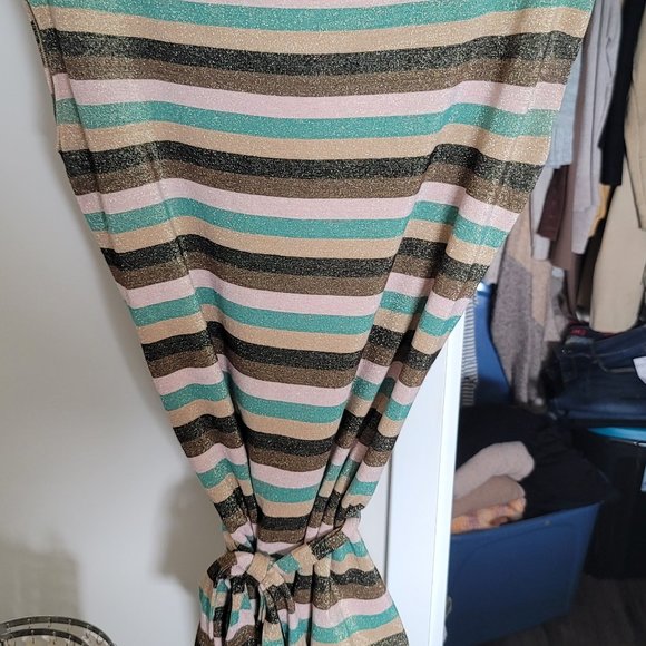 Sparkly top with strips and a belt ro tie it in with. It's in great condition and gently used. Size Lrg/XL Fitts smaller because of the tie around the waist.