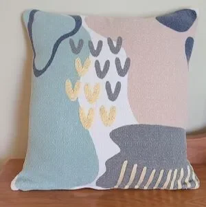 Enhance your home decor with this stylish abstract accent pillow. Featuring a blend of blue, yellow, and gray tones, it adds a modern touch to any room.