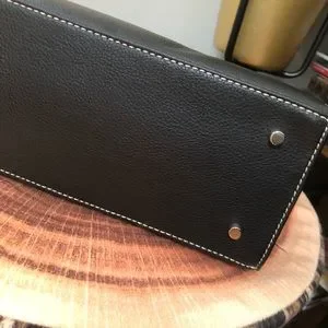 Vegan pebbled leather, with bold white stitching.
