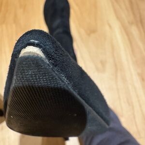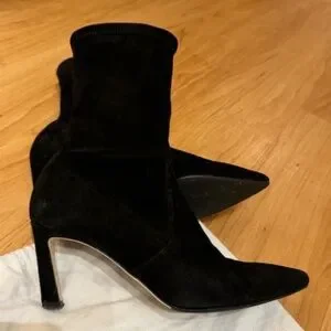 Black suede Stuart Weitzman distinctive heel booties. Balls of boots have been replaced with rubberized nonslip sole to protect the original sole. Worn very few times. There is a bit of colour rubbed off at toes (see photos). Size 7 1/2