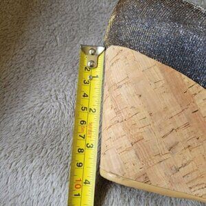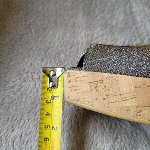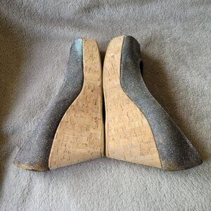 Beautiful wedges, glitter upper with open toe and cork wedge, in very good used condition. Some minor signs of wear on the soles and a couple of small marks by the toes on the insoles