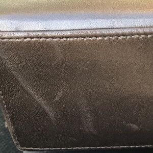 Made in Spain from Designer Stuart Weitzman, comes this vintage golden bronze leather bag, with an irregular shape, satin like fabric lining, and a flap closure with a magnetic snap.
