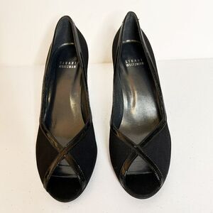 Stuart Weitzman Black Peep Toe Pumps with Patent Leather Trim Detail