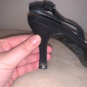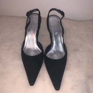 These Stuart Weitzman heels feature a sleek pointed toe and a high stiletto heel, crafted in a smooth black material for a polished look. With a classic, minimalist design, they are perfect for formal or evening wear, offering a sophisticated silhouette from every angle.
