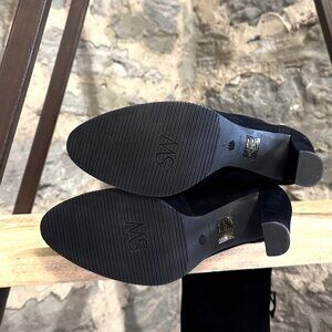 Heeled tall pull-on boots. Stretch suede. Drawstring details. Almond toe. Block heel. Black treaded rubber outsole. Made in Spain. Come as is.