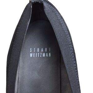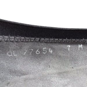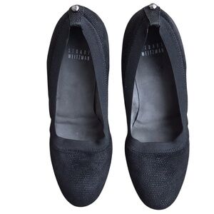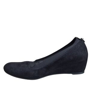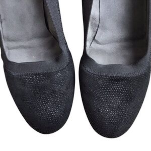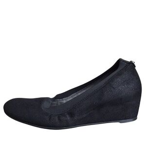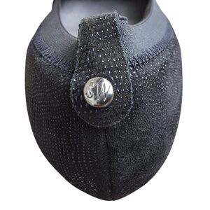 Stylish black slip on wedge shoes with a subtle metallic black textured shimmer, 2” heel, interior grey suede, silver logo button on back, and elasticized trim for comfort fit. Ideal for versatile styling.