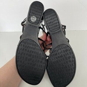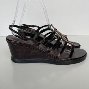 Stylish strappy wedge sandals. Features a sleek black and brown design. Perfect for any occasion.