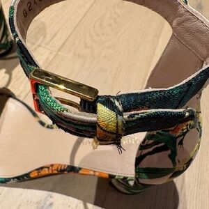 Stuart Weitzman Botanical Brocade sandals, ankle strap and buckle closure, 3” heels. 7M, in a green, multi color tropical floral print. Canvas, leather lining.