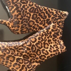 Gorgeous “choco feline” calf-hair sock booties from Stuart Weitzman online shop. Dust bag provided; box not available. Size 5.5M, rubber soles embossed with signature SW logo. Pointed toe, 2.75” kitten heel. All photos are of the actual booties for sale. Pair with your favourite camel coat and black leather skirt for a chic lunch or dinner out!