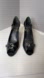 Black patent leather. Side heel cutouts. Peep toe with silver buckle. Side silver buckle accent. Cushioned foot bed. Excellent condition, a few wear marks (see all photos).