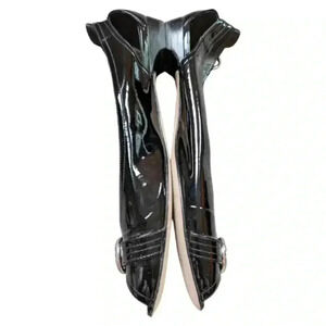 Stuart Weitzman Chit Chat Flats Peep Toe Patent Leather Black Silver Women's 9