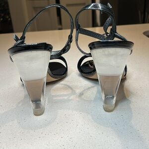 Special occasions, wedding guest, date night, clubs, dancing, formal, elegant, classy, designer, party, unique, wedge, patent, lucite, transparent, clear, black