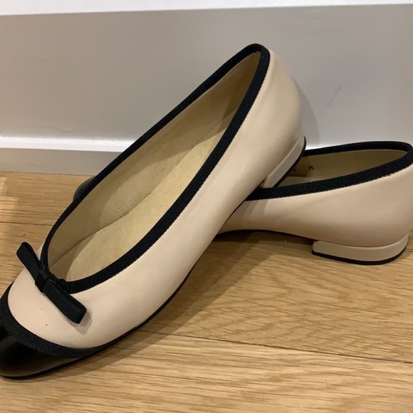 These sophisticated cream ballet flats by Stuart Weitzman feature a chic black patent leather toe cap and a contrasting black band across the top. With their timeless design and comfortable flat sole, they are perfect for both casual and business casual settings.