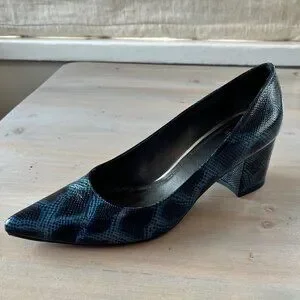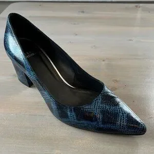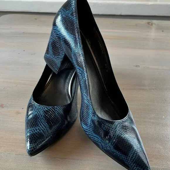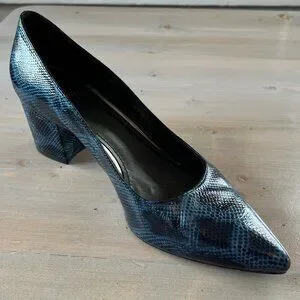 Fabrication: Navy blue leather upper patterned with snakeskin print. Pointy toe. Leather insole. Leather sole. Block heel. Made in Spain.