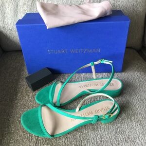 These beautiful Stuart Weitzman strap sandals are brand new with tags. (Never been worn) They are a Soirée 25 Strap Sandal in a vibrant “ Lawn Green” color with a gold buckle on the side. Made in Spain, the upper shoe is constructed from sueded leather while the inner shoe and sole are a flat beige leather. They are a size 6 US or 6.5 European sizing. Have 1 inch heels. They will add a splash of color and elegance to any outfit. Comes in original box with dust bag and suede brush.