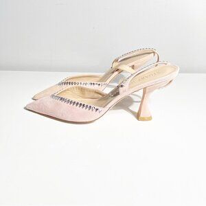 Stuart Weitzman's Xcurve pumps feature a V-cut vamp complemented by a flattering pointed toe. Anchored by a flared heel, this suede pair is trimmed with tear-shaped crystals. Lamb suede upper Point toe Slingback strap Leather sole Made in Spain SIZE Flared heel, 3.25" (85mm).