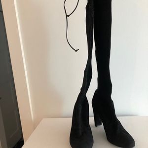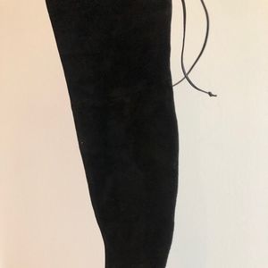 Authentic Stuart Weitzman Highland Over the Knee Boots in size 8 M pre-owned. Suede backed with Lycra® shapes a supple, slimming over-the-knee boot with attitude to spare. A back tie and flexible rubber sole ensure that the fit is great and the comfort is high.