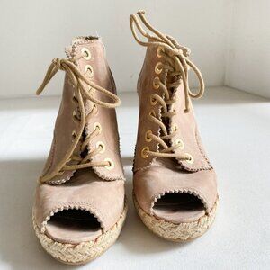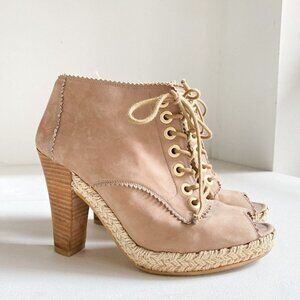 Stuart Weitzman Light Beige Suede Espadrille Detail Heeled Peep Toe Booties 7.5