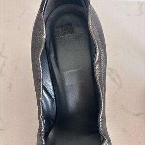 Chic Stuart Weitzman heels with a metallic sheen. Features a glossy black toe cap. Ideal for elevating any outfit. Worn twice. Excellent outer condition. Some peeling inside- see photos. Outer is like new condition. Size 7.5 3 inch heel. Rubber bottoms- perfect if you are on your feet all day.