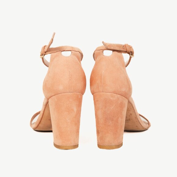 Made in Spain, the NearlyNude sandals from Stuart Weitzman are crafted in a lush peachy Naked Suede, and feature curved chunky block heels, open rounded toes, a slim and demure ankle strap with a tiny golden buckle, a small cutout at the counter, and leather lining and soles.