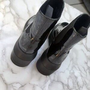 Patent black ankle Chelsea boots with a chunky sole. Stylish and modern design. Perfect for any outfit.