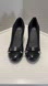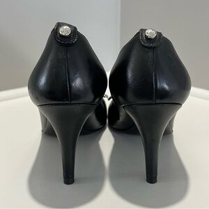 Excellent condition. A few very faint hard to see scuffs on main part of shoe, slight wear on bottom,see photos. Rounded toe. Black metal accent bow and heel charm. Three inch slender heel. Cushion insole. Leather. Toe width 3”