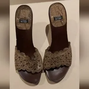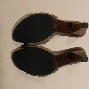 Printed gold and tan with studs, genuine leather. Wooden platform with 4" heel. Runway shoe only worn once. Like new.
