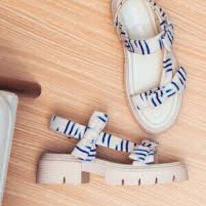 Beautiful blocked never worn Stuart Weitzman sandals. Features include a blocked heel, almond toe, lug sole, bow detail with velcro straps.