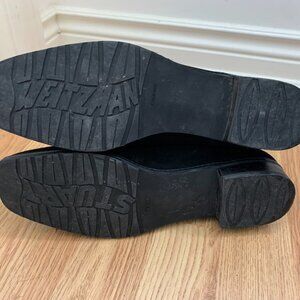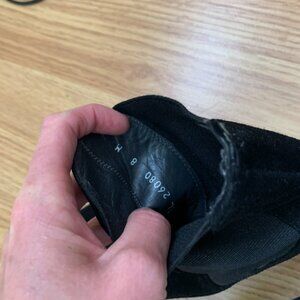 Black suede Chelsea boots. Flat, basically no heel. Great condition. Size 8. These are great boots; I just have another pair I reach for more often because they fit me better. They're stylish and versatile boots with a square toe and very low heel.