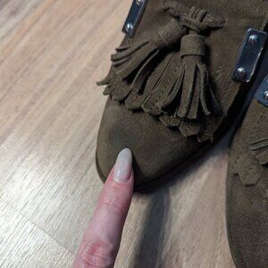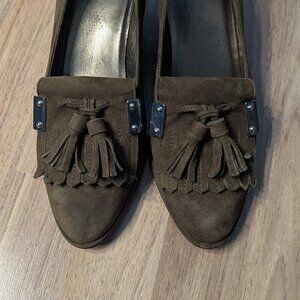 Stuart Weitzman Suede Tassel Heels | Olive Green | Loafer Style
