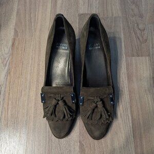 Stuart Weitzman heeled loafers in very good used condition. These sophisticated shoes feature rich olive green suede with decorative tassels and metallic hardware accents. The classic block heel and loafer styling create a versatile silhouette perfect for fall/winter wear.