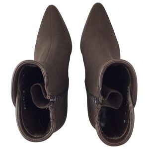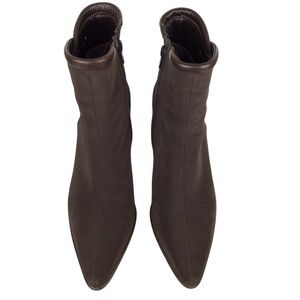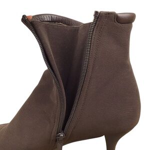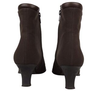 Stylish dark espresso brown ankle boots with a sleek design, pointed toe, and a side zipper for easy wear. Made in Spain with a waterproof Gore-Tex exterior and interior brown leather lining.