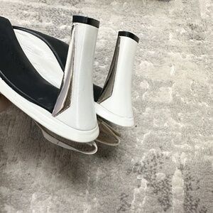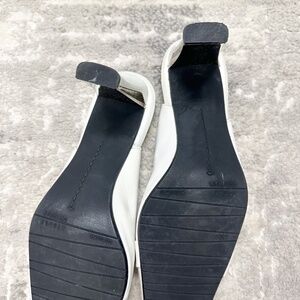 White leather with a classic square toe, sculptural heel, and polished silver buckle detail. Late 70s into 80s design—structured pumps with geometric toes, angular lines, and statement buckles were trending.