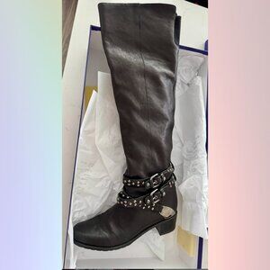 Elevate your style with these striking Stuart Weitzman Yeeha boots, crafted in rich Vecchio Nappa leather. With edgy studded strap detailing and silver hardware accents, these boots blend luxury with attitude — a standout addition to any wardrobe.