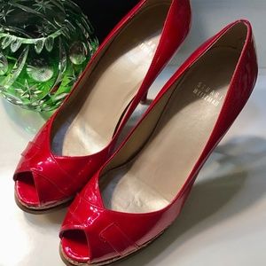 Straw platform, peep toe, in apple cherry red, very good condition and sanitized. Comfortable , very few natural signs of wear ,please see the accurate picture of all angles, all pictures accurate and true to size .