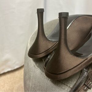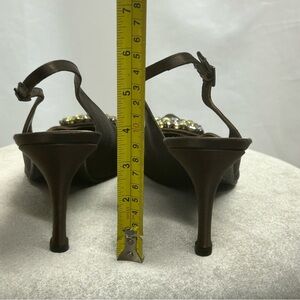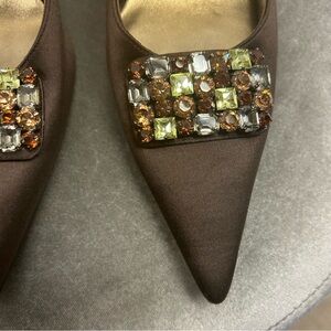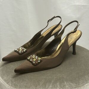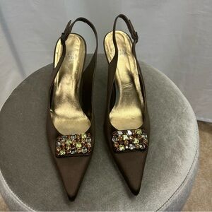 Stuart Weitzman brown satin sling back low heel gem jewelled buckle formal Sz 11