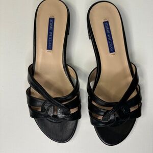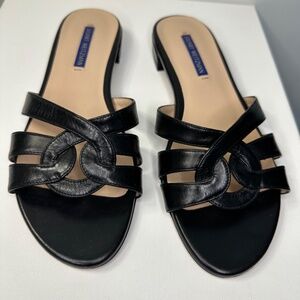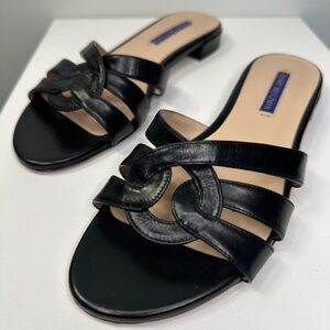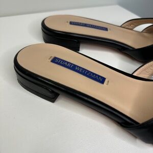 These like-new black Stuart Weitzman leather slide sandals are perfect shoes for easy wear and comfort. They have only been worn once, with minimal markings on the sole, and come with original dust bags (not shown in photos). The curved/wrapped top details are classic and stylish, perfect for summertime fashion!