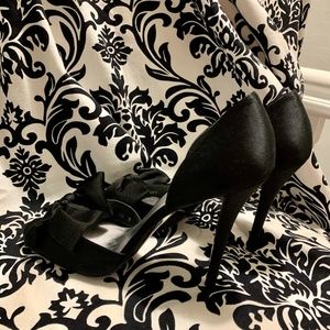Classic, elegant Stuart Weitzman black satin size 10 stiletto shoes. Satin covered heels are 3 3/4" high.   Silver leather lining.  Worn on my Birthday in NYC 14 years ago and then stored in a box since then. Tiny knick in satin on back of left heel as shown in photo.