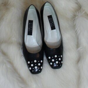 Stuart Weitzman navy leather lined, with white leather inside, casual cozy comfortable shoes block heels(6.5 cm) white circle cut leather pattern size 8.5; preowned in good condition