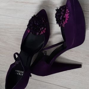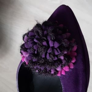 size 38.5 purple suede pumps. stuart Weitzman. pompom detail on toe. in good shape. no scuffs one slight fading in suede